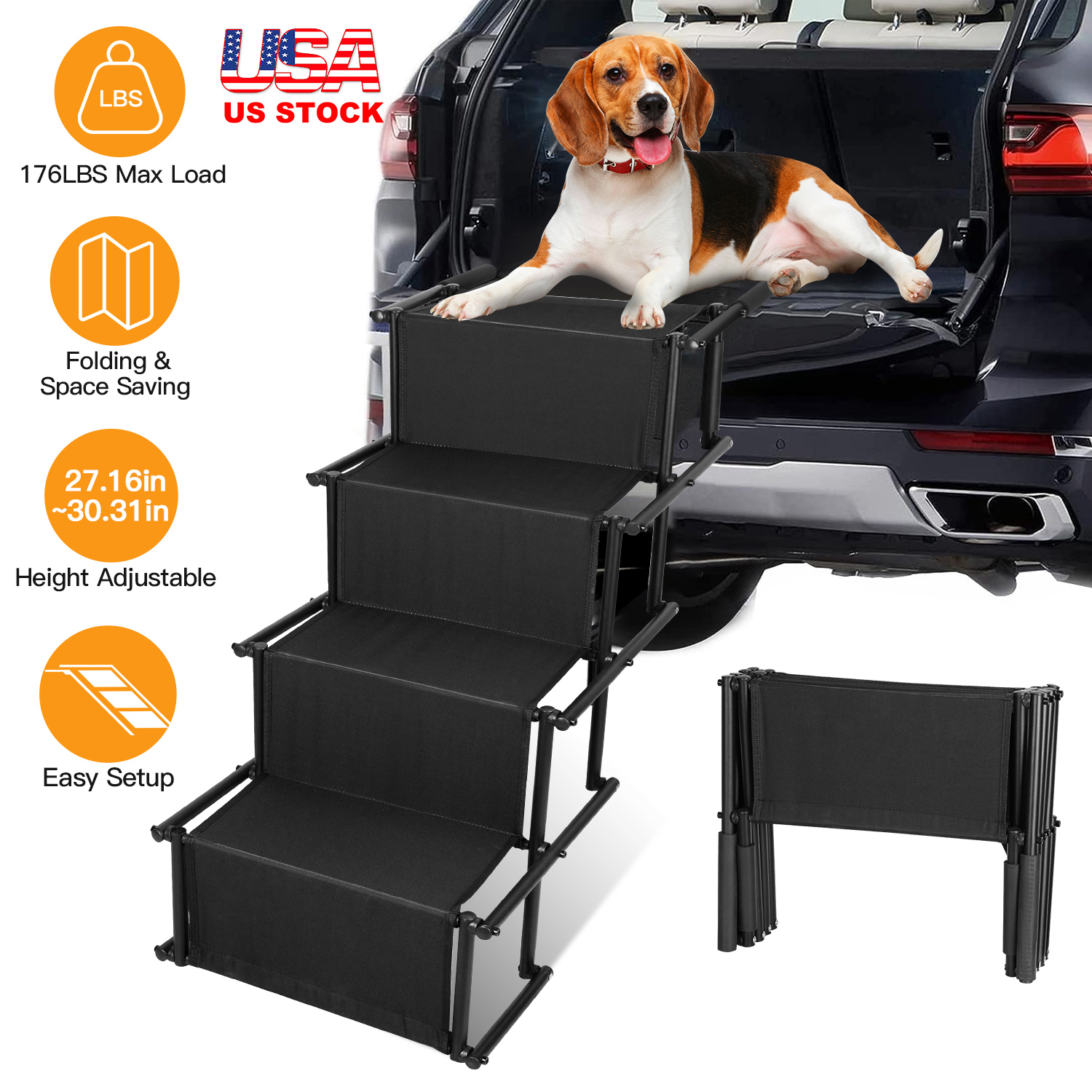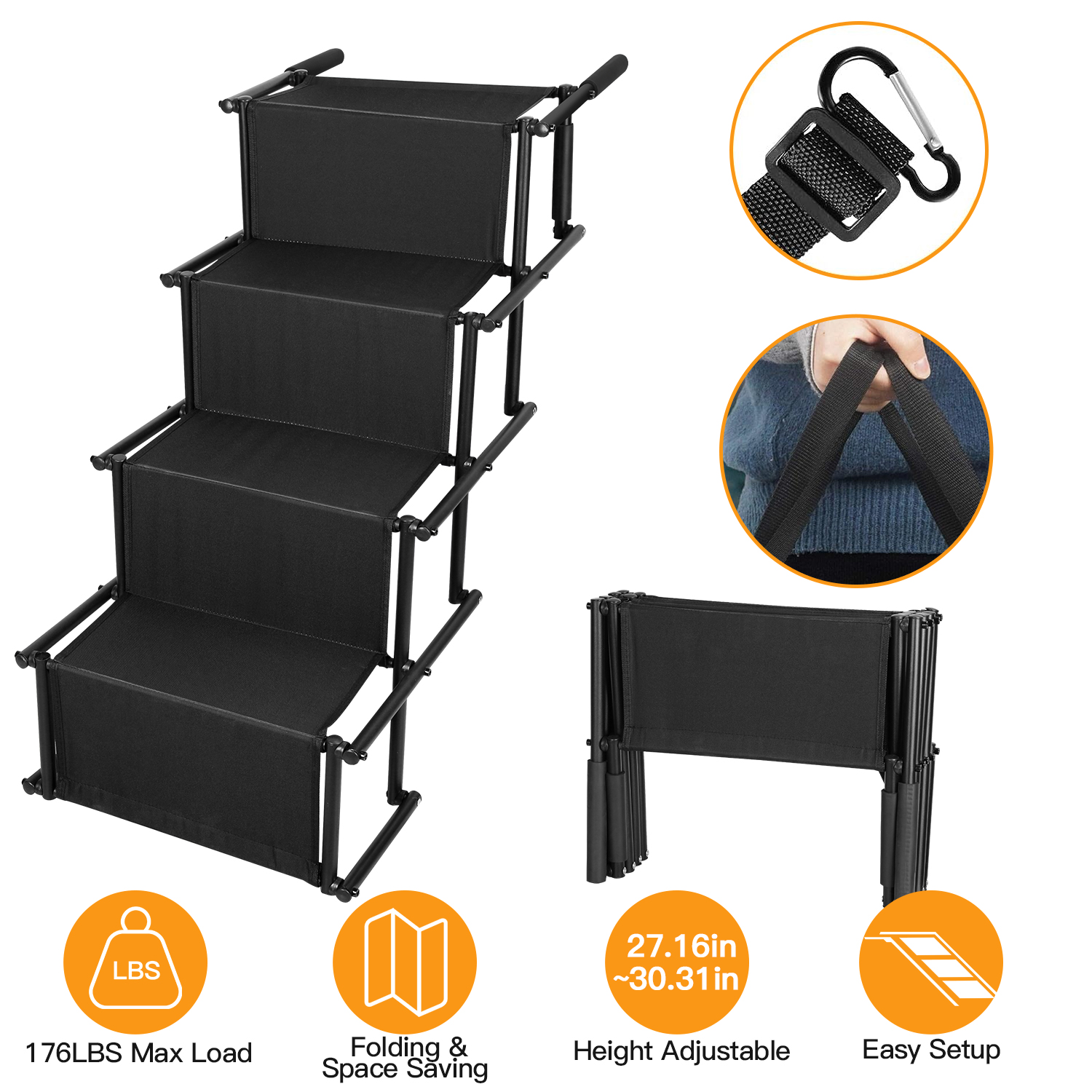 Foldable Dog Ramp 4 Step Collaspible Non Slip Stairs for Car Trucks SUV 176LBS Load Oxford Fabric Steel Ladders with Straps Tether Clip